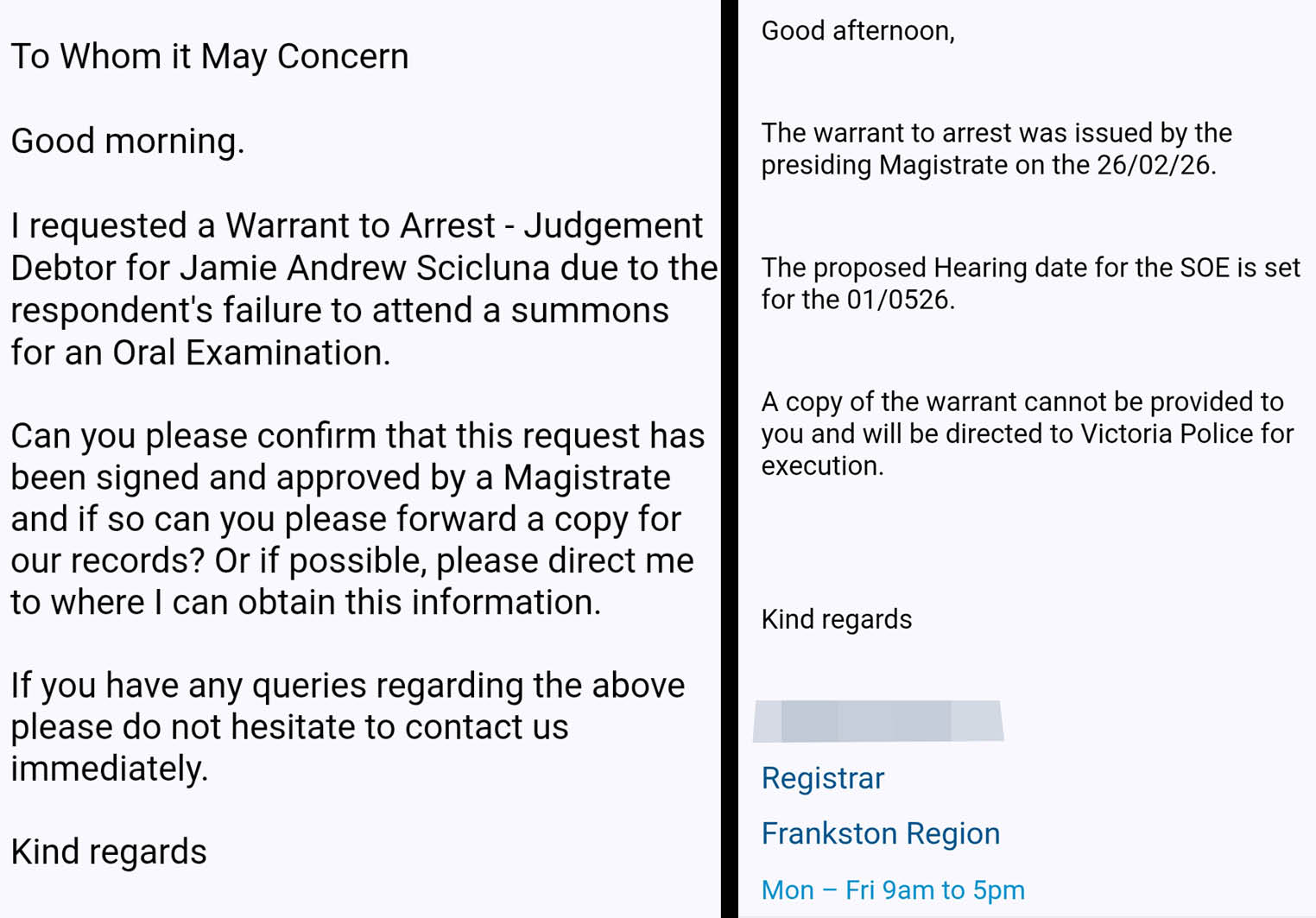 In January this year, the Herald Sun reported that Scicluna had faced Frankston Magistrates Court on a dozen enforcement matters brought by Melbourne, Port Phillip and Wyndham councils pertaining to over $16,000 in parking and toll fines.