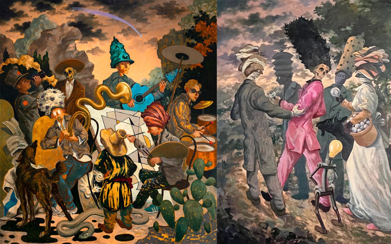 The exhibition title reflects Vale’s layered approach to artmaking. “The cuckoo is a bird that steals things from other birds,” Vale explains, “like me borrowing bits and pieces from old masters and comic books.” The herring pays homage to his lifelong favourite artist James Ensor whose Skeletons Fighting over a Pickled Herring (1891) profoundly influenced his use of odd characters, skulls and the absurd. And the trembling tambourines encompass the artist’s love of music, the supernatural and the absurd.